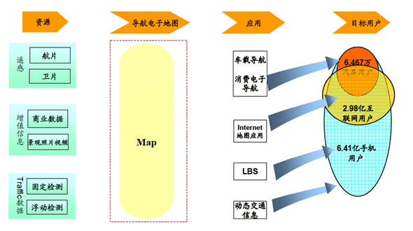 公司的下游主要包括:1)車載導航系統(tǒng);2)PND,便攜導航系統(tǒng)(導航儀);3)電子地圖服務,包括互聯(lián)網(wǎng)地圖服務,基于LBS的地圖服務,交通系統(tǒng)的地圖服務。